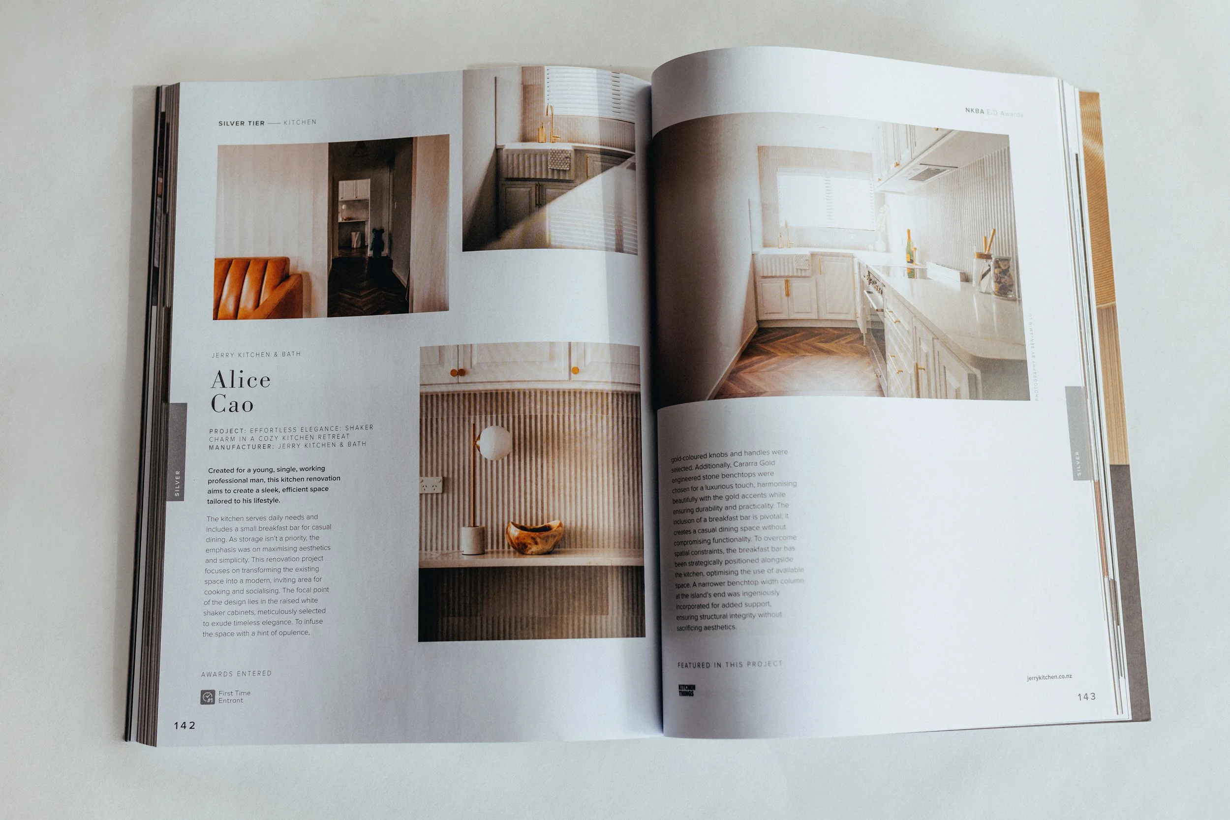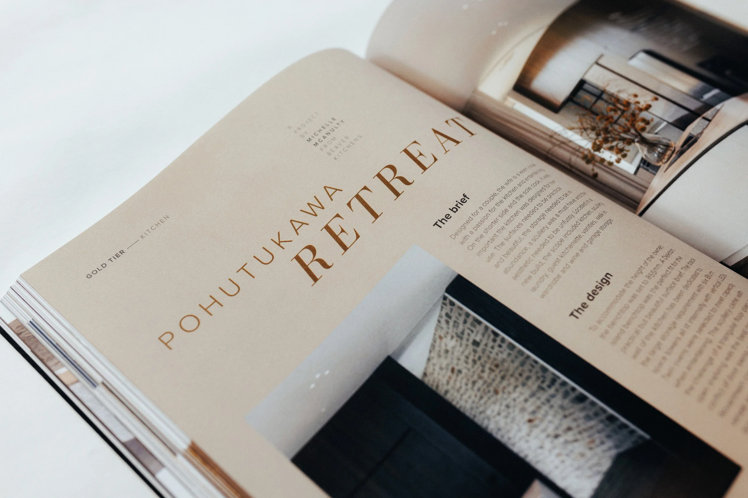 The Excellence in Design Magazine is a showcase of all the best Kitchen and Bathroom designs in New Zealand. It is an annual 200+ page long publication which champions beautiful design. It is printed on a gorgeous uncoated stock with a stunning effect on the cover. This magazine is intended to be a treasured keepsake and the client and the designers highlighted in the publication are truly delighted with the outcome.